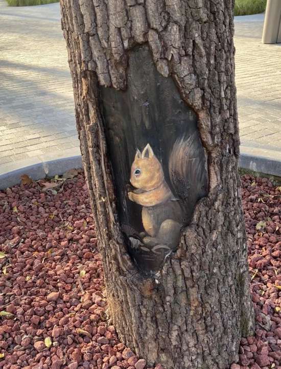 由于樹洞所在位置大小、形狀、深淺、高矮都不同,結合公園周邊環境,繪畫師們經過前期對現場探訪設計后,才開始對樹干破損區域進行繪畫創作,在保持趣味性和賞玩性的同時,又保持樹木原來的形狀和面貌。在樹洞上作畫也可以有效地保護樹木。