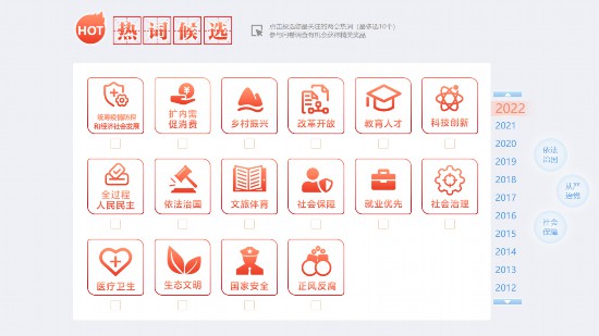 2、選擇您關注的熱詞(最多不超過10個)進行投票并回答調查問卷,參與答題越多、獲獎概率越大。