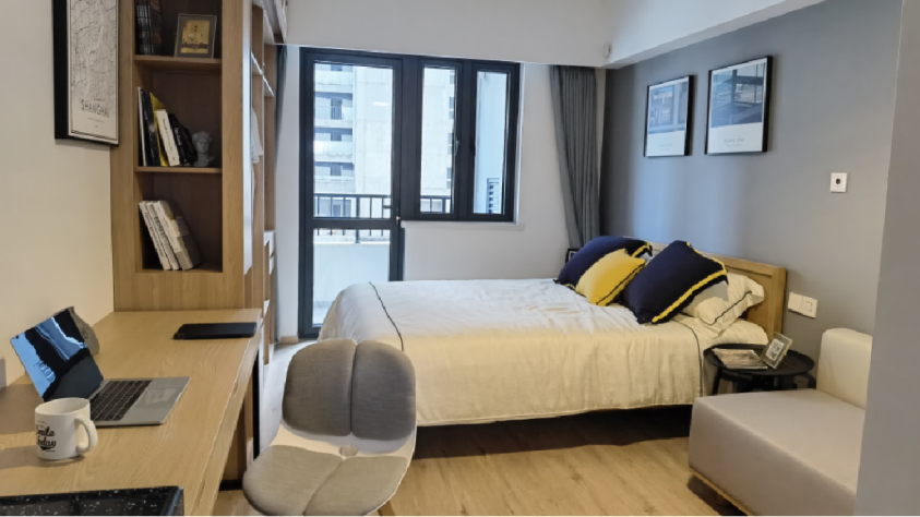 楊浦置地公司112項目經理沈元凱介紹:“這個項目是我們開發的第一個保障性租賃住房,面向的客戶群體是有住房需求的新市民和剛畢業的大學生,整個設計方案包括后面的運營維護都要考慮不同的配套??紤]到年輕人有拎包入住的需求,所以對整個項目的室內裝修包括硬裝和軟裝,以及裝修風格是否滿足年輕人的喜好都考慮在內?!?/p>