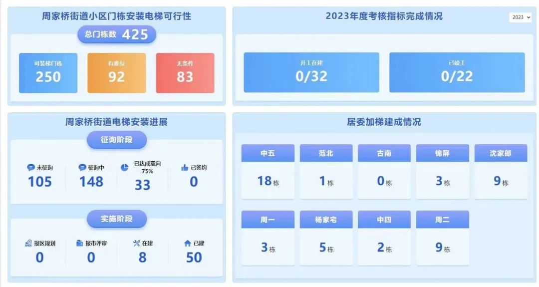 據周家橋街道辦事處副主任李曉明介紹,街道希望通過數字化手段,實現加梯流程全覆蓋,不僅有利于街道對轄區250個可加裝電梯樓道進行統一管理,也利于居民了解自己樓棟內的加梯情況,為不斷增進民生福祉、持續創造高品質生活插上智慧的翅膀。
