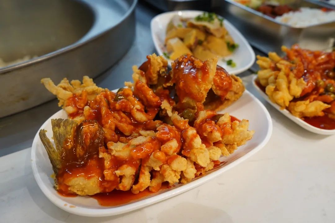 “鱸魚要開花刀、取骨頭;東坡肉先蒸后炸,肉質酥嫩。這些菜市民在家里做起來麻煩,這里花上15到25元就能買到?!?/p>