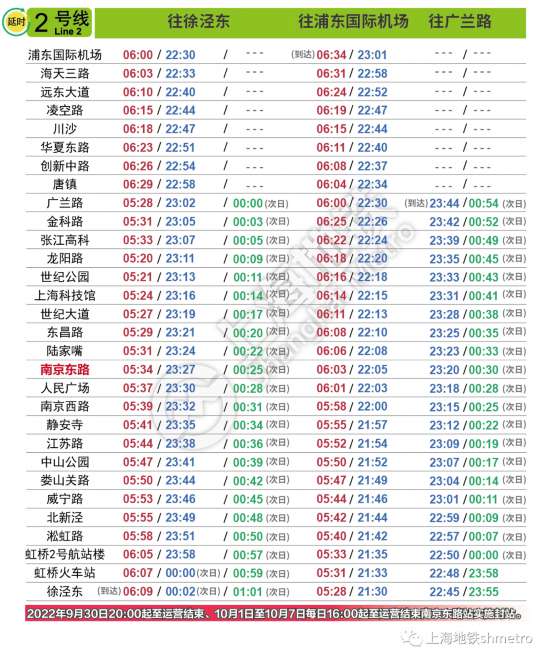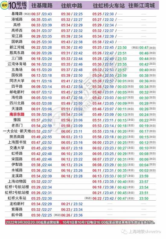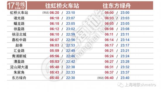 返程旅客可選擇乘坐地鐵2、10、17號線離開虹橋火車站前往目的地,三條地鐵線路的首末班車時刻表見下圖,目前末班車以常態化運營(藍字)為準。