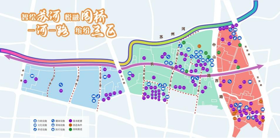 2020年以來,周家橋街道圍繞推進“一刻鐘便民生活圈”建設,以社區居民為服務對象,以步行15分鐘左右為服務半徑,形成了“一河一路,繽紛三區”為導向的行動規劃,即在蘇州河沿線打造“紅色+生態”濱河秀水帶,沿主干道長寧路打造“綠色+生活”交互空間軸,針對不同區域的空間特質,形成“商業服務+”“公共服務+”“時尚品質+”的“繽紛三區”,著力打造能閱讀、可觸摸、有溫度的國際精品濱水型社區。