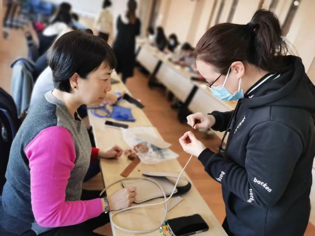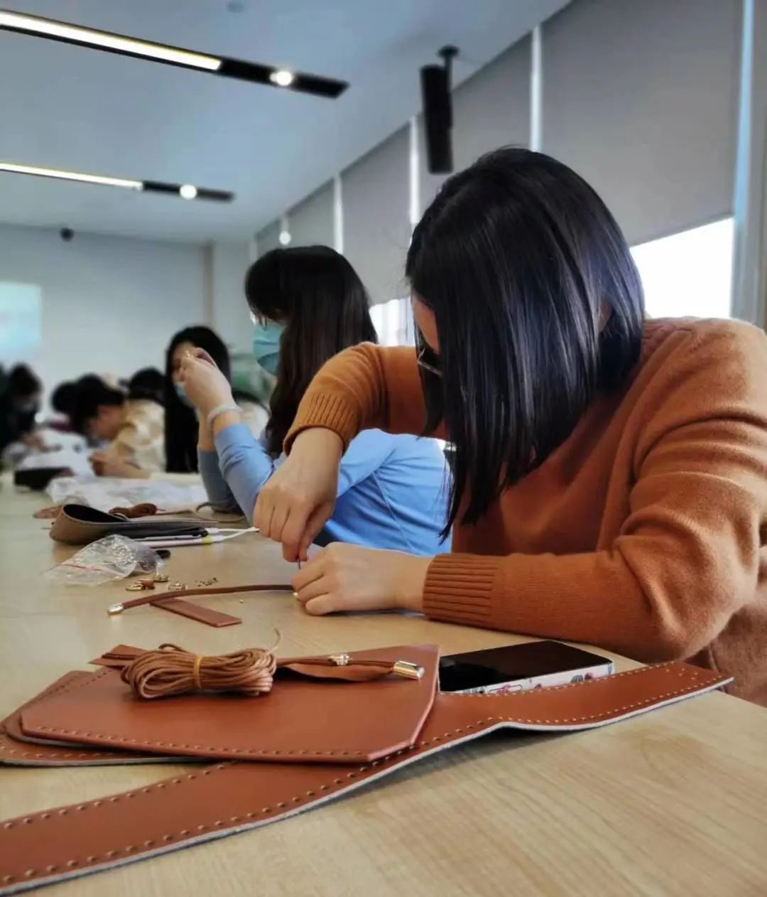 看著老師手上完成的精致皮具,學員們興致盎然,躍躍欲試,很快沉浸在一針一線的手工縫制中。一番忙碌之后,一個個時尚的挎包呈現在大家眼前。