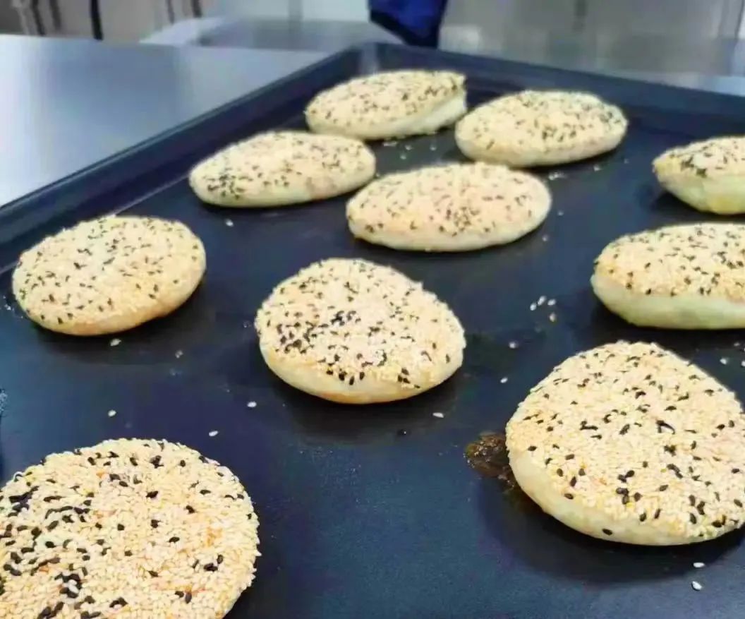 與此同時,教室外飄來了陣陣糕點的香氣。原來是烘焙教室里,生活美學老師正在帶領學員們制作中國傳統面點——黃橋燒餅。在老師的指導下,大家用水揉面、醒面、擰劑子、搟皮、包餡、刷蛋液、粘芝麻……經過多道面點制作工序,香氣撲鼻的黃橋燒餅新鮮出爐啦!