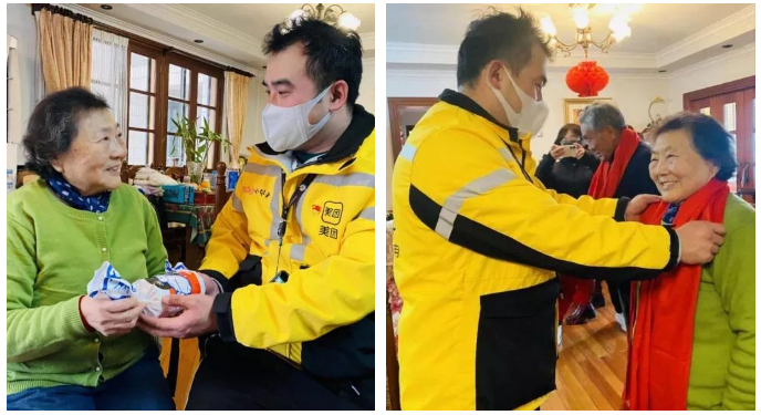 進門口,外賣小哥們為老人送上了水果、甜點、圍巾等慰問品。還細心地詢問老們日常生活中有沒有需要照顧的地方,令兩位子女不在身邊的高齡老人十分感動。而這群“黃騎士”的暖心之舉背后,其實是新華路街道和外賣騎手們“雙箭頭”的愛。