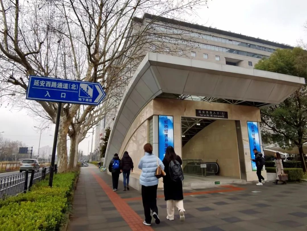跟隨沿途的指示標識來到延安西路婁山關路路口附近,記者看到了已開放通行的延安西路地下通道出入口(北),彼時不少市民正由此進入通道,前往延安西路以南的新虹橋中心花園和住宅社區。