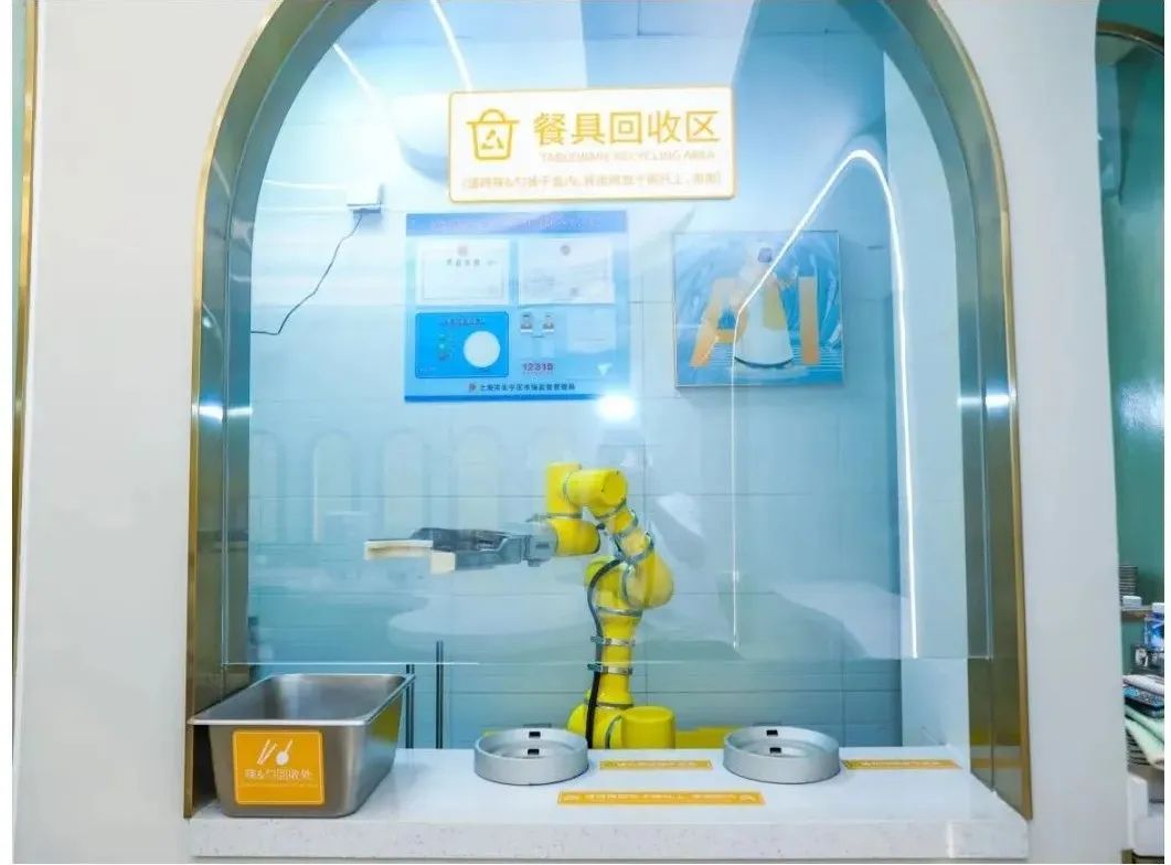 而店內的另一臺機械臂,則忙碌在“餐具回收區”。白領在享用完面之后,將餐具放入餐品回收區的指定位置,機械臂會自動將碗中殘留倒至濕垃圾箱內,完成垃圾分類。