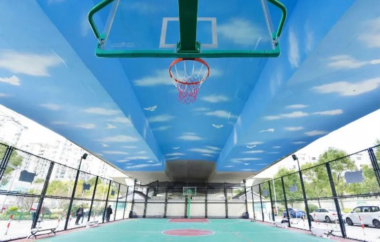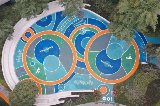 此外,還有一個活力四射的洛克公園,時尚籃球場配備8個籃球架、休息椅凳、自動販售機等功能性設施,橘紅、粉色等鮮亮顏色使整個運動空間充滿活力氣息。