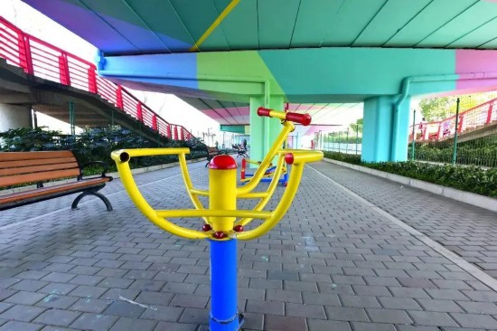 浦東新區高行鎮的趙家溝北側橋下空間通過改造體育運動場所,增設兒童游樂設施,并通過主體墻繪、景觀照明等軟性裝飾,將閑置或未被充分利用且沒有明確功能的橋下空間打造成集健身運動、休閑娛樂、景觀綠地等復合型功能于一體的活動場所。