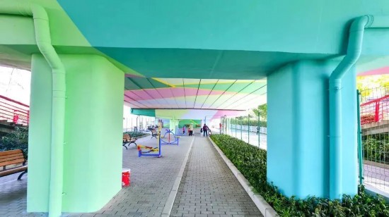 市交通委介紹,橋上車水馬龍,橋下別有洞天。如今隨著上海城市規模的不斷擴張,城市道路和軌道交通里程也在急速增長,其中各類快速交通設施的建設帶來通行便利的同時,也增添了很多橋下空間。橋下空間是城市公共空間的重要組成部分,卻也是常常被“遺忘”的地方,成為城市“灰色空間”。原來灰色的水泥地面和墻面,抹上了多彩的新貌,令人心曠神怡眼前一亮。