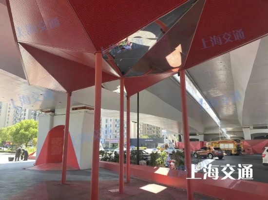 古北路橋下空間位于長寧路古北路附近,以紅色三角彩鋼為元素,創造出一個富有活力的公共空間。