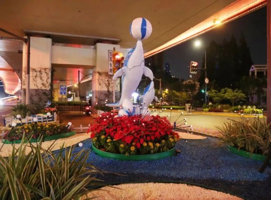 項目以“生態人文”為設計理念,鋪設藍色陶粒寓意海洋,白色陶粒寓意沙灘,其間粉色的杜鵑、金黃的非洲菊和百日草、吊牽?;ǖ然ɑ芡衅鹆艘恢恢惶S的海豚,象征著人與海洋和諧共生的環保理念。