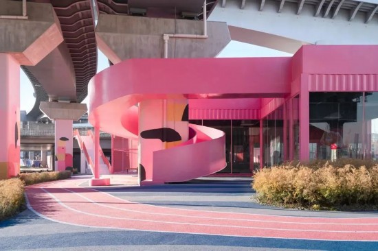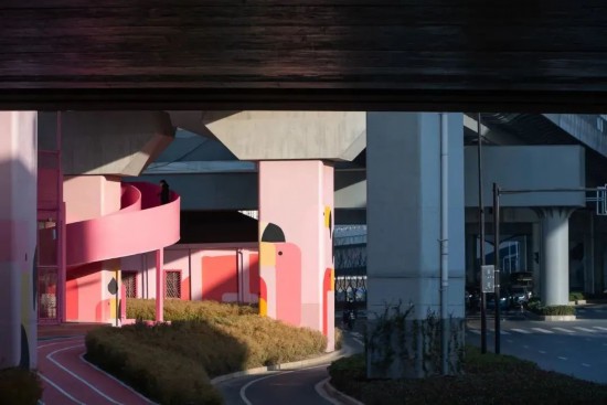 在長寧區蘇州河畔、北翟路高架下,全新的火烈鳥公園與周邊的環境形成了鮮明的對比,很難不讓人眼前一亮。橋下的整體色彩選用明亮而富有想象力的粉色系,呼應了火烈鳥主題,打破原本場地給人帶來的灰暗印象,讓中環橋下空間的形象煥然一新。