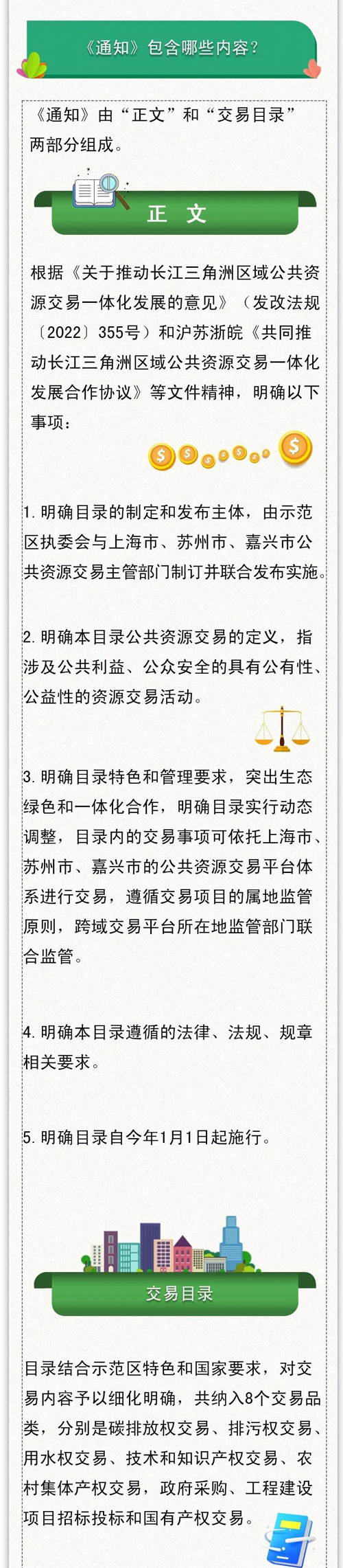 人民網上海2月15日電 (記者唐小麗)為貫徹落實國家發展改革委《關于推動長江三角洲區域公共資源交易一體化發展的意見》和三省一市《共同推動長江三角洲區域公共資源交易一體化發展合作協議》的有關部署,長三角生態綠色一體化發展示范區執行委員會與上海市、蘇州市、嘉興市公共資源交易主管部門聯合印發了《關于印發<長三角生態綠色一體化發展示范區公共資源交易目錄(2022年版)>的通知》(以下簡稱《交易目錄》),在示范區公共資源交易一體化重點領域率先開展探索,形成有利于要素自由流動和高效配置的良好環境。