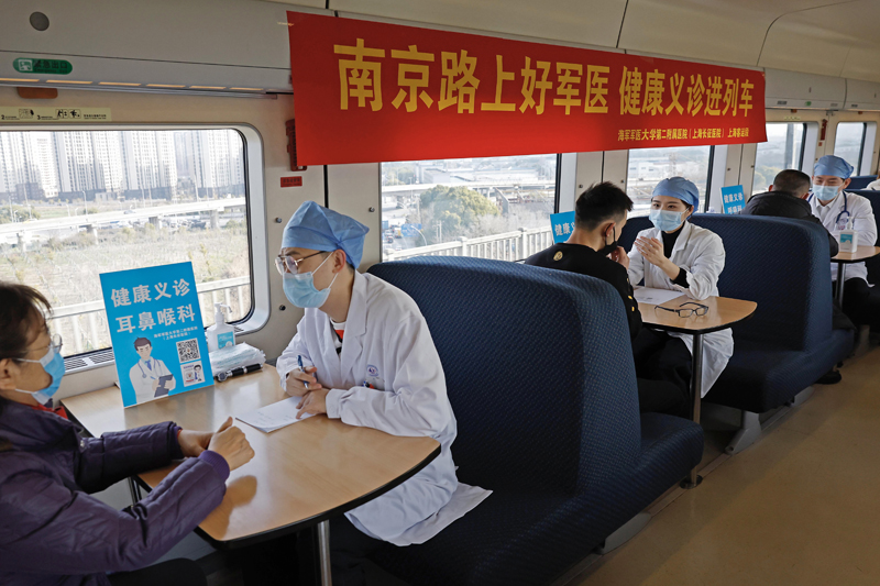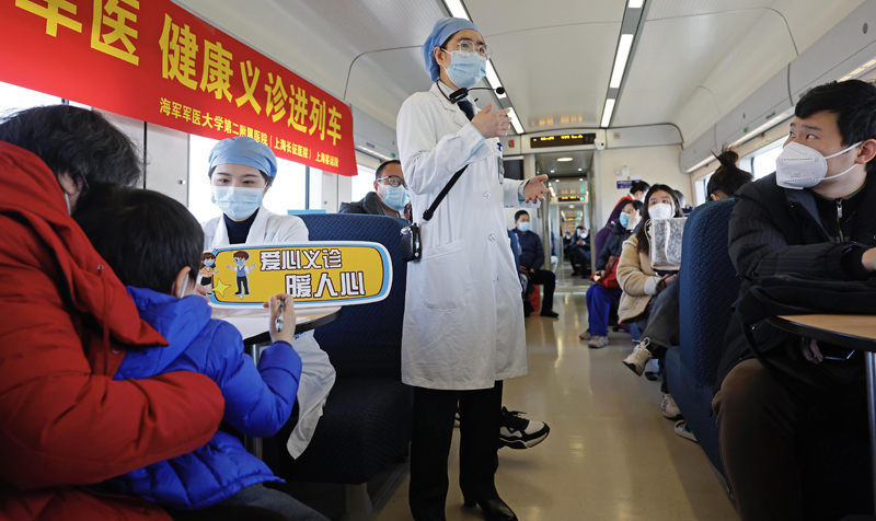 “本次列車邀請了海軍軍醫大學第二附屬醫院(上海長征醫院)感染科、呼吸科、眼科還有耳鼻喉科的醫療專家在餐車開展義診活動……”隨著列車廣播聲響起,旅客們陸續聞聲趕來。