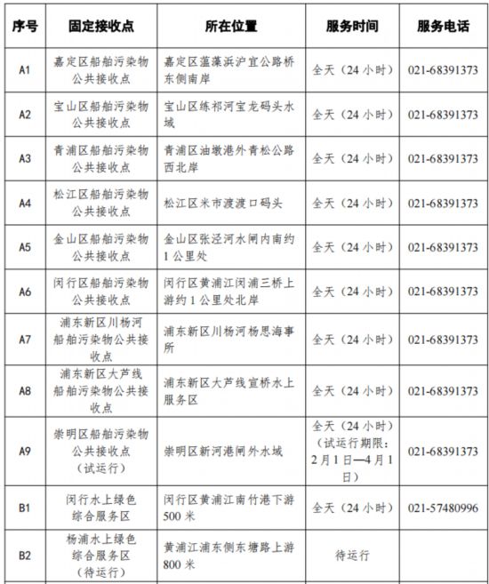 我市11個公共固定接收點均實行24小時服務,船舶可直接前往送交污染物。黃浦江閔行發電廠下游固定接收點的服務電話:021-57480996;其他內河通航水域9個固定接收點的服務電話:021-68391373。