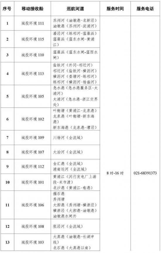 船舶可根據自身需要向調度中心(電話:021-68391373)咨詢相關線路的流動接收船實時信息,就近送交污染物。其中,黃浦江閔行發電廠下游(線路15、16、17)實行預約服務,船舶送交污染物需提前24小時預約(預約電話:021-68788930)。流動接收船的服務時間為每天8時至16時。