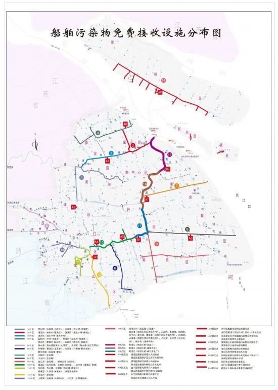 我市已設置11個船舶污染物公共固定接收點(含1個待運行)。其中,黃浦江閔行發電廠下游水域2個,分別為:閔行水上綠色綜合服務區(黃浦江南竹港下游500米)、楊浦水上綠色綜合服務區(黃浦江浦東側東塘路上游800米,待運行)。其他內河通航水域9個,分別位于浦東、嘉定、寶山、青浦、松江、金山、閔行、崇明等8個區的內河骨干航道(詳見下表)。
