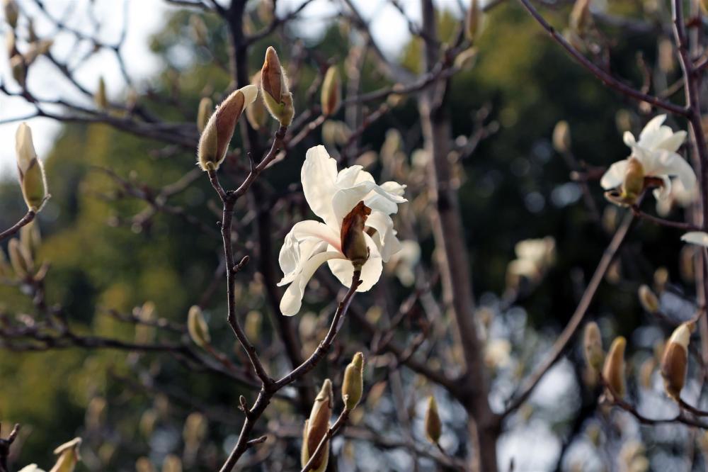 就算溫度沒有出現“斷崖式”下跌,但如果始終維持在0℃左右的區間內,一些白玉蘭也可能出現“瘌痢頭”——枝頭上的花一部分開了,一部分則遲遲不開,甚至不開就枯萎,呈現花瓣發褐枯掛枝頭的景象,影響整體的觀賞效果。
