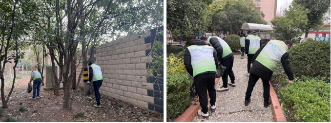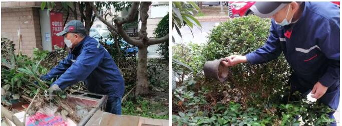 乾溪物業保潔人員對祁連四村一街坊公共區域、綠化帶內雜物、枯枝落葉進行清理,并搬走堆積的廢舊花盆。