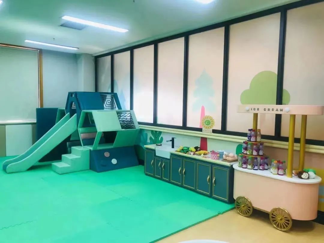 位于驛站二樓的寶寶屋針對1-3歲兒童開放,分為運動游戲區、益智玩樂區、互動閱讀區,同時配備寶寶鞋架、寶寶置物架、幼兒盥洗室等便利照護設施,在地面、墻面、轉角采取安裝防撞軟墊等保護措施,保證孩子們安全地玩耍。