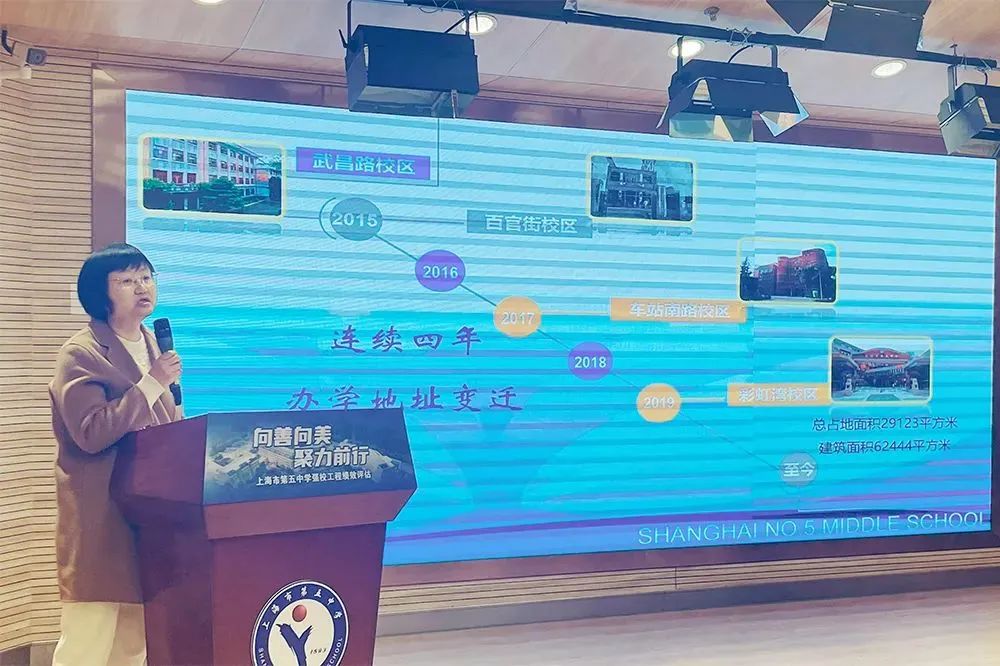 上海市第五中學校長李西雙以《向善向美 聚力而行》為題,從概況、路徑、增值、發展和特色這5個部分匯報了學校開展“強校工程”以來的思考和收獲;重點關注學校內涵發展、深化課程教學改革、優化教師發展機制、暢通學生成長通道、打造學校辦學特色、改善學校生態環境共6個方面,介紹了學校的實踐與成長。