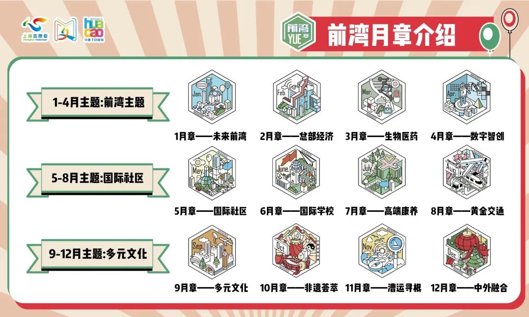 當天,華漕鎮新時代文明實踐分中心特別為華漕的志愿者設計的12枚“前灣月章”也同時發布。據介紹,所有參與華漕鎮新時代文明實踐志愿服務并在“上海志愿者網”記錄時長的志愿者都有機會獲得當月專屬“前灣月章”。全年徽章共分“未來前灣”“國際社區”“多元文化”三大主題。具體而言,首先在華漕志愿者中記錄時長排名前200名。其次,參與“前灣YUE章”新時代文明實踐特色項目并提供服務,且在“上海志愿者網”記錄時長。隨章送出的還有與徽章一一對應的、有獨一編號的YUE章志愿者證書,讓每位志愿者都是“獨一無二”。同時,如獲章志愿者愿意的話,文明實踐分中心還會向其所在單位或學校發送感謝信。