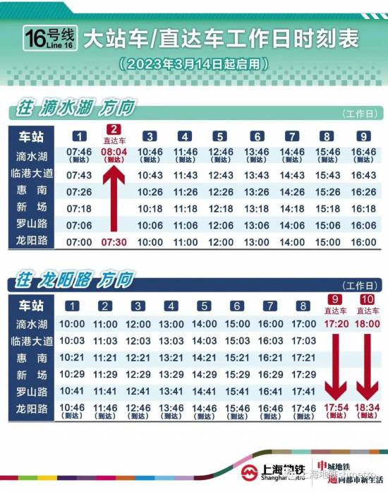 為進一步滿足臨港地區與市區之間的通勤客流需求,更好地發揮直達車運營效益,2023年3月14日起,16號線工作日直達車方案將有所調整:工作日晚高峰將增加一班由滴水湖站始發至龍陽路站的直達車,滴水湖站發車時間為18:00;同時結合現場客流情況,原中午12:00滴水湖站始發至龍陽路站的直達車將調整為大站車,并取消原12:30龍陽路站始發至滴水湖站的直達車。此外,雙休/節假日方案不調整。