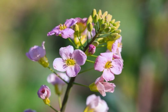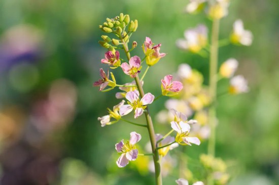 金、黃、粉、白、紫五色油菜田呈條帶狀分布,與藍天白云共同繪制成春的畫卷,仿佛闖入了童話夢境。