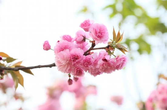 關山櫻,俗稱“紅纓”,是日本晚櫻的代表種。同時也是八重櫻的一個代表性品種,在中國廣泛栽種。關山櫻花葉同開,春葉紫褐色,花蕾紅色,花粉紅色,花瓣33—35 枚。濃妝艷抹,滿滿是熱情的奔放感。