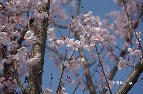 ‘小彼岸’櫻——推斷為江戶彼岸與豆櫻雜交種?;ò?枚,花朵嬌小,開花后略下垂,花色粉白色,萼筒基部球形隆起,先花后葉。