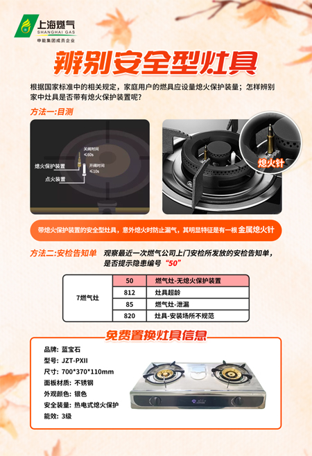 溫馨提示:長寧區老舊小區等居民家庭熄火保護裝置燃氣灶具全覆蓋工作,可為符合條件的居民免費置換臺式燃氣灶具,如家中為嵌入式灶具,則需前往大眾燃氣指定營業所購買,方可進行補貼。
