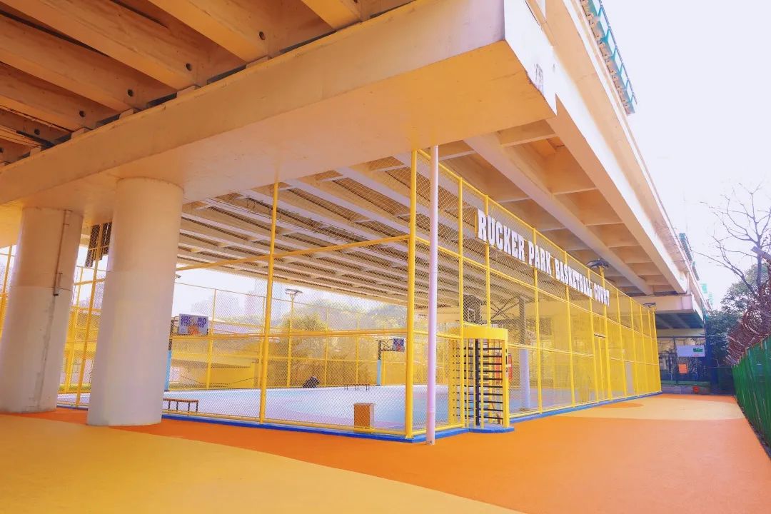 記者在現場看到,嶄新的籃球場以黃色、藍色和橙色為主色調搭配,讓原本暗淡的橋下空間變得活力多彩。整個運動空間分為橋下和橋外兩部分,其中,橋下空間有4片三對三的籃球場;橋外空間則包括了4片三對三以及1片五人制的籃球場,以滿足周邊白領、市民的不同籃球運動需求。