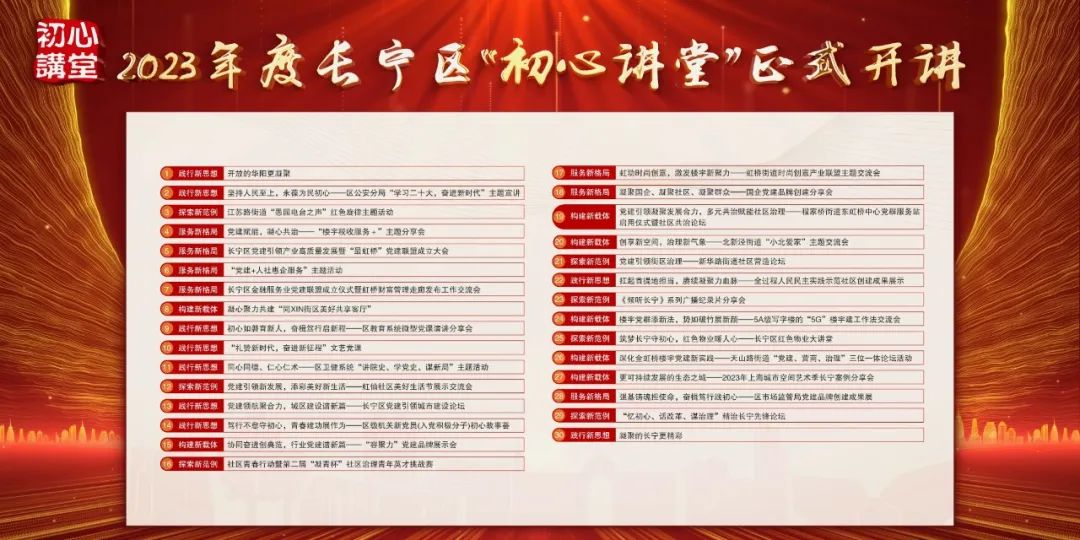 今年是“凝聚力工程”建設30周年,活動上,2023年度長寧區“初心講堂”30講系列活動正式發布。據介紹,今年的初心講堂將聚焦“凝聚力工程”的初心使命,圍繞“踐行新思想、服務新格局、探索新范例、構建新載體”四個方面,進一步擴大“凝聚力工程”的影響力和示范效應。