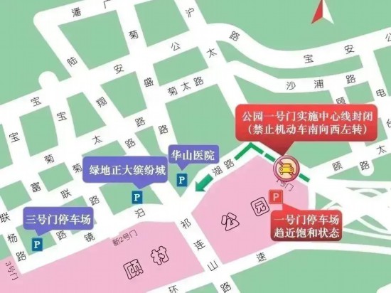 當滬太公路顧村公園1號門停車場接近飽和時,封閉公園1號門中心隔離,機動車至滬太公路鏡泊湖路左轉,沿鏡泊湖路按綠地正大繽紛城、公園3號門停車場、華山醫院順序依次有序停車。
