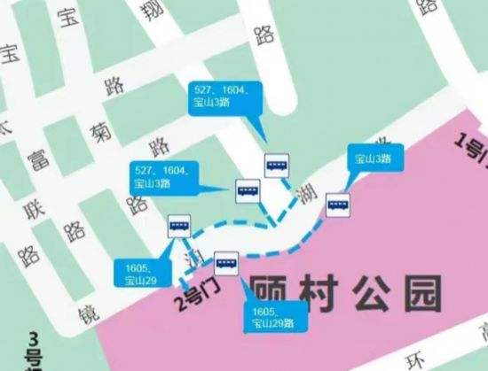 顧村公園2號門(鏡泊湖路沿線)公交線路有寶山29路、1605路、527路等線路,其中寶山29和1605路在路鏡泊湖路寶菊路站下車后,步行至路口南側即到達公園2號門。