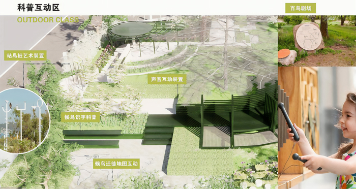 “為進一步促進人與自然和諧共生,我們根據花園的主題,設計了不同的區域功能。比如科普互動區域設有候鳥識字科普、候鳥遷徙地圖互動等。通過人性化設計,幫助人們更多地了解鳥類,走近自然、親近自然?!钡谌皆O計團隊工作人員說。