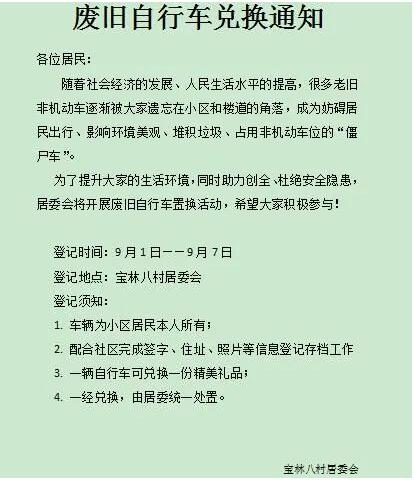 針對小區非機動車亂停放的問題,寶林八村居委會開展了“益”起來兌換的活動。鼓勵居民將放置在公共區域、車棚內的廢舊自行車及時處置,拿到居委可兌換小禮品,打造干凈整潔的社區環境,保持消防通道暢通,消除安全隱患,助力創建全國文明城區。