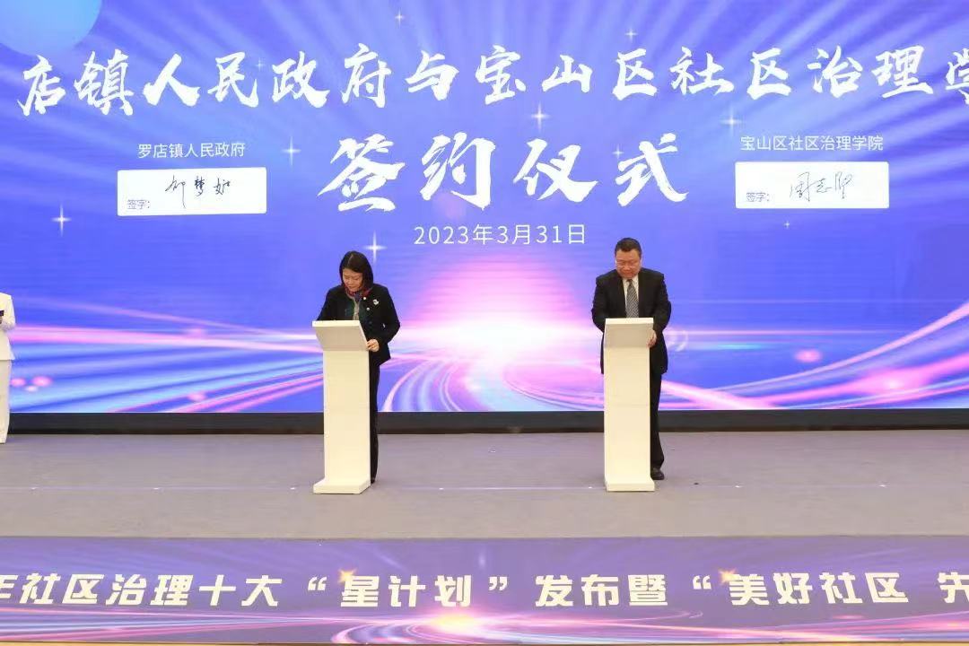 寶山區社區治理學院院長周志堅和羅店鎮黨委副書記、鎮長郁夢嫻共同簽署《寶山區羅店鎮人民政府、寶山區社區學院關于開展社區教育賦能社區治理的合作協議》。