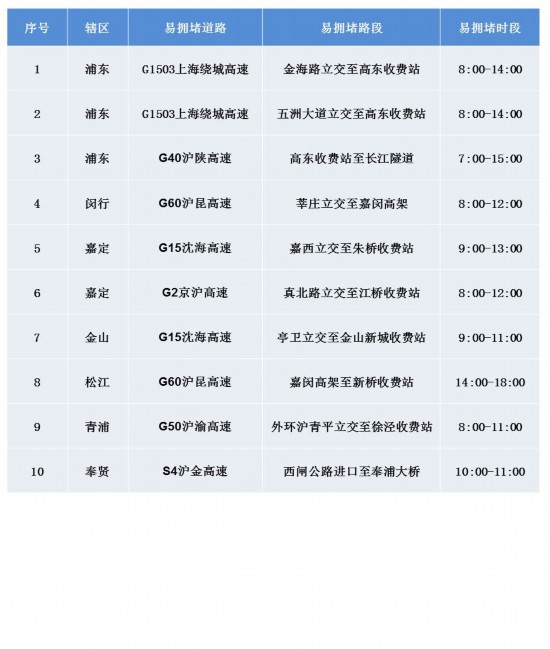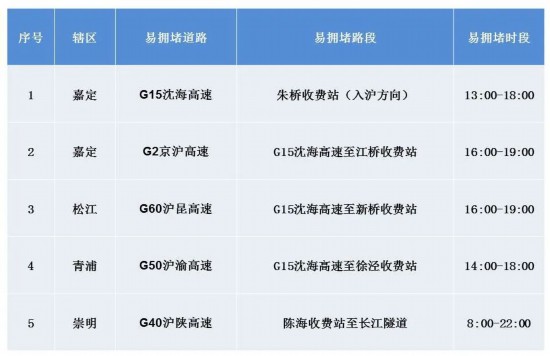 節前一天:預計下午至晚間,G40長江隧橋、G1503高東入口、G2江橋、G50徐涇、G60新橋主線等部分射線高速公路出城方向流量仍將較為集中,將進一步引發時段性、方向性擁堵。