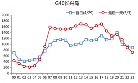 今年“五一”假期期間,高速公路免費通行,高速公路路網流量將呈現“假期首尾雙高峰”的特點。預計“五一”假期期間,日均高速公路進滬流量將超36萬輛次、出滬流量將超37萬輛次。出城高峰預計出現在4月28日午后至4月29日上午,返程高峰預計出現在5月2日午后至5月3日晚間。通往啟東、太倉、蘇州、嘉興等方向的高速,包括G40滬陜高速、G1503上海繞城高速、G50滬渝高速、G60滬昆高速、G2京滬高速等,存在較大通行壓力。此外,與高速公路相連的滬崇蘇立交、莘莊立交、滬青平立交、真北立交等“高接高”路段預計將出現擁堵情況。