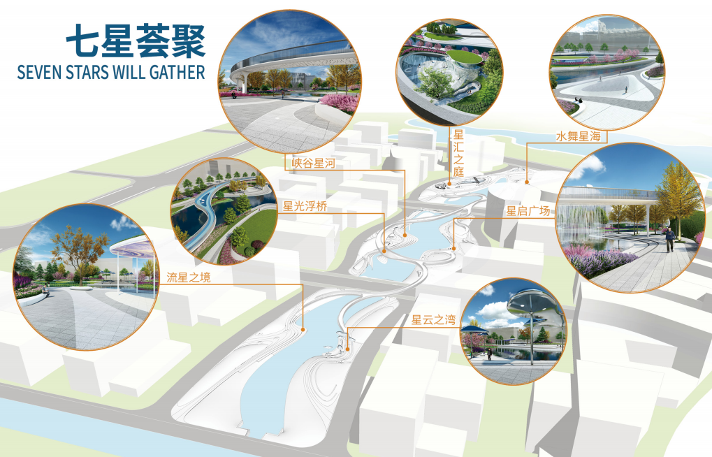 項目以水為帶,以道路為界,將基地劃分為“一帶三區七星”。
