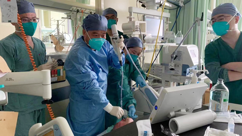 鄧星奇(左二)正在對患者進行床旁纖支鏡檢查
