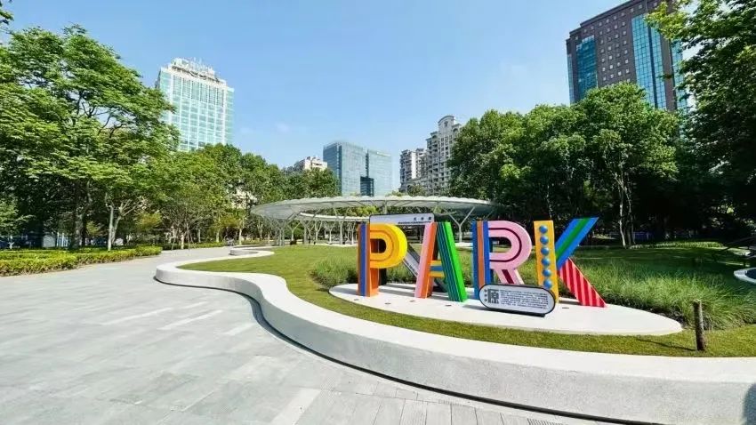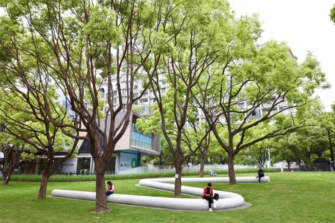 在公園北側“S”形的地景藝術景觀頗為吸睛,市民游客在這里可坐、可躺、可騎,真的是既美觀又有趣。據王曄菲介紹,這個裝置看似特別,實則動足了腦筋,整個裝置的形狀正是為了繞開五棵園內本有的高大香樟樹,這個裝置也成為市民游客休憩賞景的好去處。