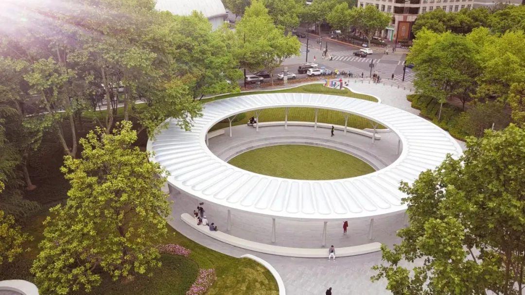 “虹橋源亭”下方設置四條弧形座椅,中心設有兩級下沉臺階,營造出劇場感和聚集感,400平方米的活動空間可舉辦各類公益活動、小型音樂節、發布會、購物節等,進一步吸引更多游客群體,豐富公園游玩體驗感,為周邊居民生活和虹橋開發區發展帶來新的活力。