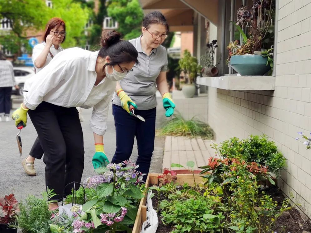 只見志愿者們熟練地挖土、種植,大家相互協作,很快便讓園地煥然一新。園地內集結檸檬樹、薄荷、繡球花、銀葉菊、月季花、太陽花、蘿卜、玉米、上海青等植物,兼具觀賞性和食用性。