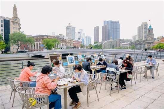 虹口北外灘沿線既有諸多歷史建筑,又能一覽河岸美景,是眾多攝影師、畫家前來采風的取景地,亦是市民、游客們休閑的打卡地。在昨天下午的北外灘,除了評彈演出,一場面向市民的創意繪畫手作活動也在“世紀同框”廣場如火如荼地進行著。