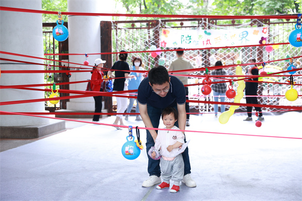 在寶寶屋室內專場,有的爸爸帶寶寶在“小廚房”里扮家家燒飯、打掃、做家務;有的陪寶寶在“小臥室”里裝扮自己、整理衣物;還有的帶著寶寶們在“小書房”翻閱圖畫書,享受親子閱讀帶來的快樂;在戶外大草坪、噴泉池,吹泡泡、解救小動物、涂鴉迷宮、捕魚小達人等互動游戲,讓爸爸們享受與孩子的親密時光。靜安區早教研究指導中心的老師現場指導爸爸們科學地觀察寶寶如何與環境互動,指導新手父親身體力行地參與育兒,充分了解、掌握孩子早期能力的培養方式。