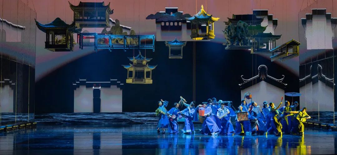 舞劇《運·河》以繁華蘇州、水墨江南、千年運河為視角,用當代的舞蹈語匯、極具跨度的表現手法展現了蘇州的文化、風物、富饒以及運河兩岸人民對美好生活的追求,演繹了一段關于人、船、河交錯交輝交融的絕美故事,勾連出運河人的情感與命運,投射出運河文化與運河精神。